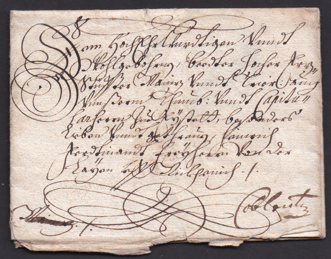 "Regensburg", 1673, "Marquardt Bischof zu Eichstädt", eigenhändige Unterschrift auf gesiegeltem kleinem Schnörkelbrief nach Coblenz