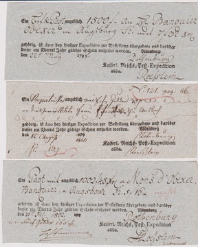 "Rothenburg", 1798-1805, drei Postschein-Provisorien der Reichspost, je Ortsvordruck "Nürnberg" hs. in "Rothenburg" geändert