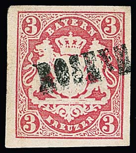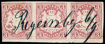 "Regensburg", ungewöhnliche alleinige handschriftliche Entwertung "Regensbg. 6/9" auf teils sehr breitrandigem Dreierstreifen Wappen 3 Kr. rosa (linke Marke links angeschnitten)