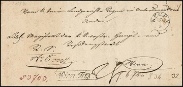 "Regen", 1834-1843, Fingerhut-K1 auf sieben Briefen, einmal 1834 nach Wien mit seltenem Wiener Orts-Tax-Ra1 "Wien. Tax."