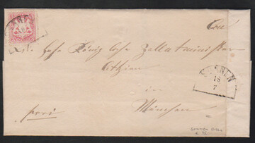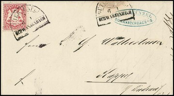 "Schwarzenbach", seltener Güterexpeditions-HK als Markenentwertung auf Brief (dieser rechts oben über dem Absenderstempel und Zweitabschlag des HK kleiner Randfleck) mit Prachtstück 3 Kr. rosa 1872