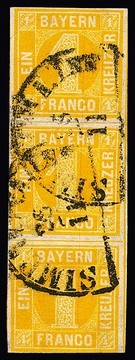 "Simbach a. Inn", HK klar auf senkrechtem Dreierstreifen 1 Kr. gelb, untere Marke unten kurz berührt und teils Knitterspuren, sign. Sem