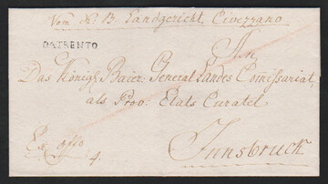 "Trient", (1808), bayerische Postanstalt in Tirol, L1 "DA TRENTO" auf Briefhülle nach Innsbruck