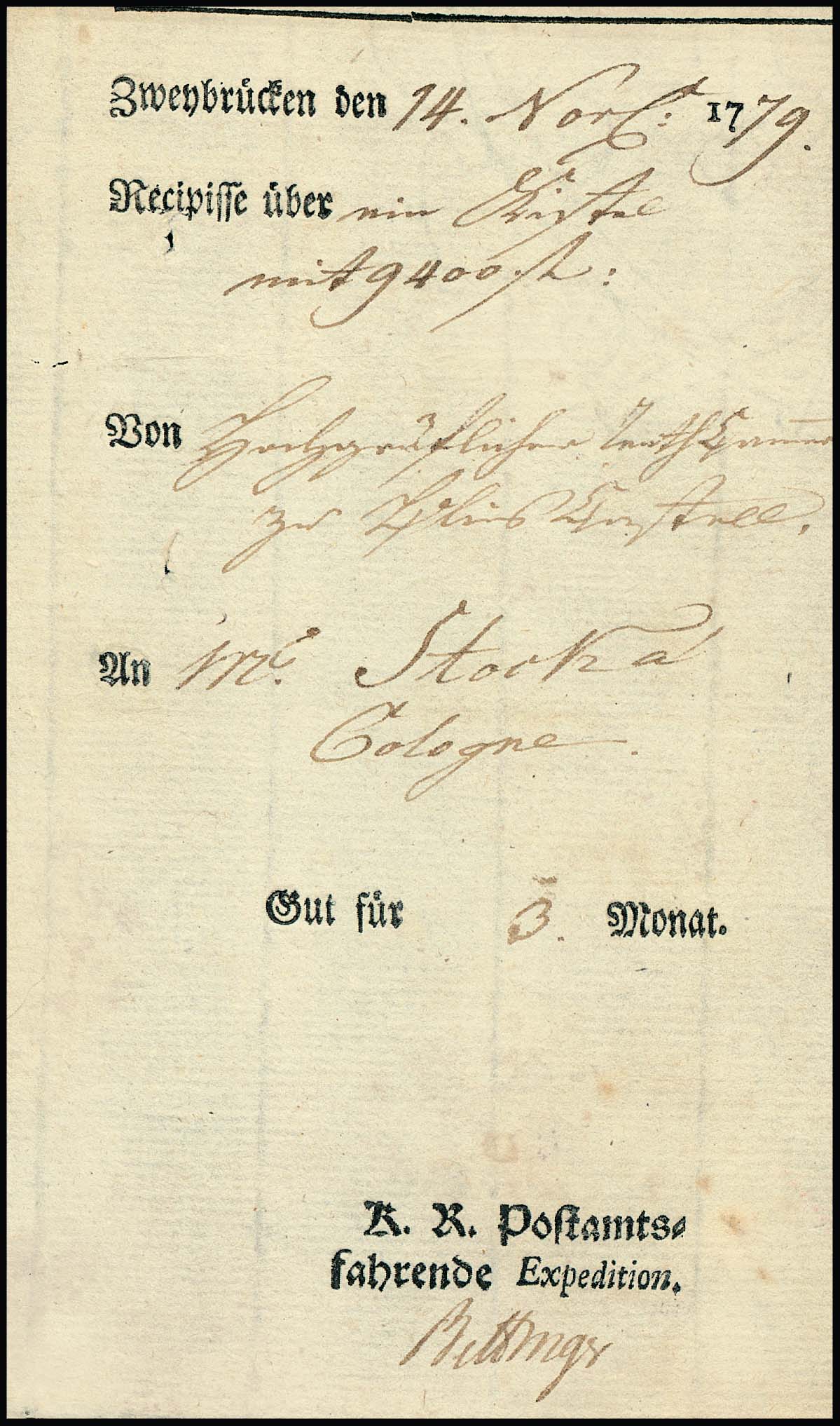 "Zweibrücken", 1779, seltene Ortsdruck-"Recepisse" ("Zweybrücken") im Hochformat als Einlieferungsschein für eine Wertkiste über 9400 Gld. nach Köln, "K.R. Postamts fahrende Expedition", min. Altersspuren