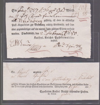 "Würzburg", 1807, ("In fidem"), und "Dinkelsbühl" 1780, zwei Ortsdruck-Postscheine der Reichspost
