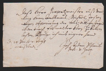 "Weissbach", 1698 ("Waißbach Post. H. Insp."), seltener handschriftlicher Postschein