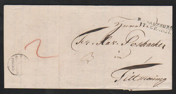 Desinfektionspost, 1831, klarer K1 "KOENIGL. BAYERISCHES SANITAETS SIEGEL" rückseitig auf Brief mit Rayon-L2 von Salzburg nach Tittmoning