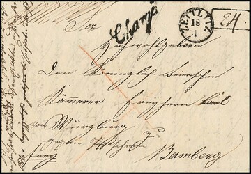 "Zettlitz", 1839, Fingerhut-K1 nebst Schreibschrift-L1 "Chargé" und seltenem stummem Reco-Ra1, hs. "24", auf Brief nach Bamberg, die Chargé-Gebühr von 4 Kr. bar bezahlt. Attest Pietz