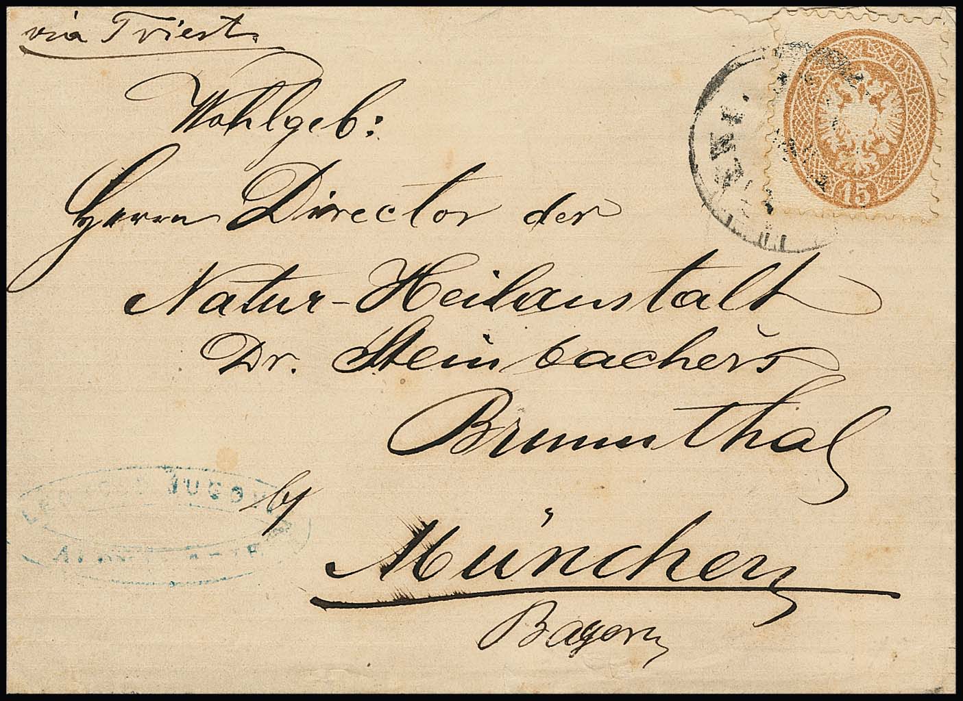 Incoming-Mail, 1868, Faltbrief (min. Papiermgl.) aus Alexandria/Ägypten mit Levante-Vorläufer 15 So. ockerbraun (Pracht) via Triest nach München, selten!