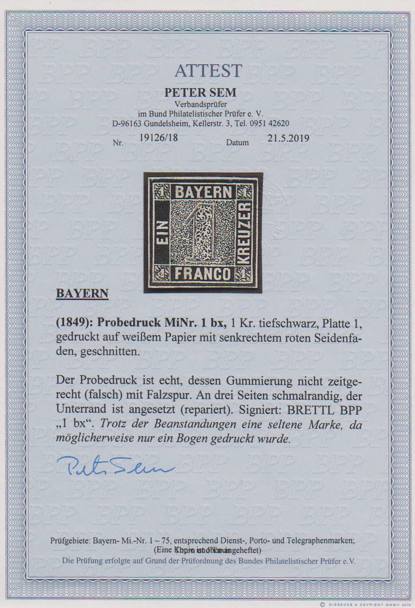 1 Kr. tiefschwarz, der Probedruck mit senkrechtem rotem Seidenfaden ungebraucht mit nicht originaler Gummistruktur, Unterrand angesetzt, optisch dennoch attraktives Exemplar dieses seltenen Probedrucks, von dem nach Literatur nur ein Bogen gedruckt wurde. Mi. 3500,-, sign. Brettl und Attest Sem