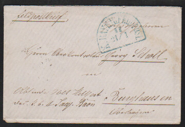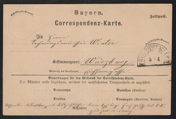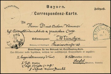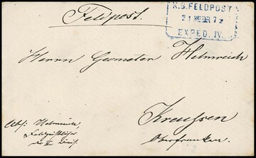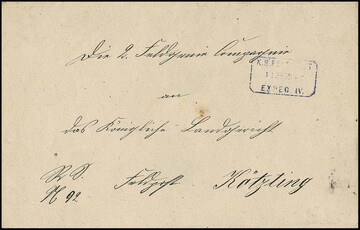 Feldpost, 1872, blauer Ra3 "K. B. FELDPOST EXPED. IV" auf Damencouvert nach Kreussen