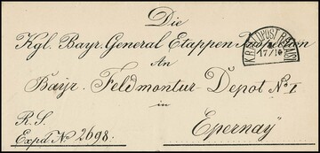 Feldpost, 1870/71, HK "K. BAYER. FELDPOST VI" auf zwei Briefen, ferner HK "K. B. FELDPOST RELAIS I" auf Brief, sowie der HK "K. BAYER. FELDPOST" ohne Nummer in blau bzw. schwarz (2) auf drei Briefen, u.a. Vordruck der "1. Feld-Genie-Division"