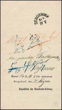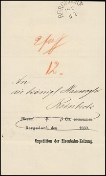 1860, HK "Bergedorf" auf Vordruckbrief der Eisenbahn-Zeitung (innen Rechnung), als Doppelbrief (hs. "2fach = 12") nach Reinbeck