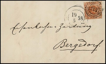1858, Kabinettbrief Dänemark 4 Sk. braun mit NS "113" und K2 von Altona nach Bergedorf mit rs. Ankunfts-HK, sign. Lange