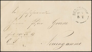 1859, HK "Bergedorf" auf Brief (oben Falte), geschrieben in Wentorf, mit Taxe "6" via Hamburg nach Rendsburg