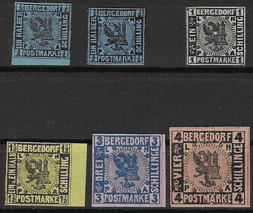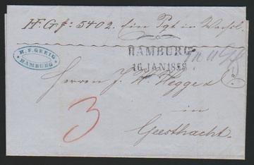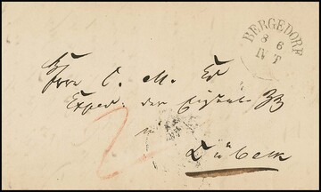 1858/1862, drei gef. Briefe (eine Paketbegl.) aus gleicher Korrespondenz von Hamburg (zweimal Fußpost-, einmal Schmetterlingsstempel) an Hegge in Geesthacht, einmal der rs. K2 in rot, einmal in schwarz, je nebst HK "Bergedorf", einmal ohne rs. Transit- und Ank.-Stempel