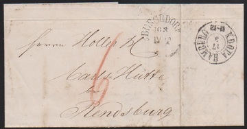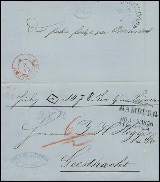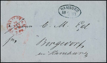 1863, Brief mit rotem Aufgabe-K1 "Frankfurt a.M." via Hamburg (vs. schwarzblauer Ovalstempel) nach Bergedorf
