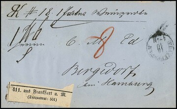 1860 (ca.), seltener Paketbegleitbrief (am Rand unbed. getönt) mit K1 "Frankfurt a.M." und entsprechendem Taxquadratzettel nach Bergedorf (rs. HK)