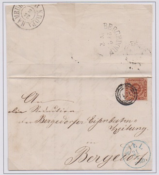 1860, HK "Bergedorf" auf vorgedrucktem Nachnahmebrief der Bergedorfer Eisenbahn-Zeitung nach Hagenow