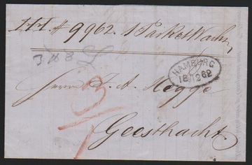 1858, gefalteter Paketbegleitbrief mit Aufgabe-Schmetterlingsstempel "Hamburg" nach Geesthacht, rs. entspr. roter K2 und schwarzer HK "Bergedorf", ungewöhnlich rs. hs. Bef.-Vermerk "Das Paket folgt per Omnibus", leichte Altersspuren