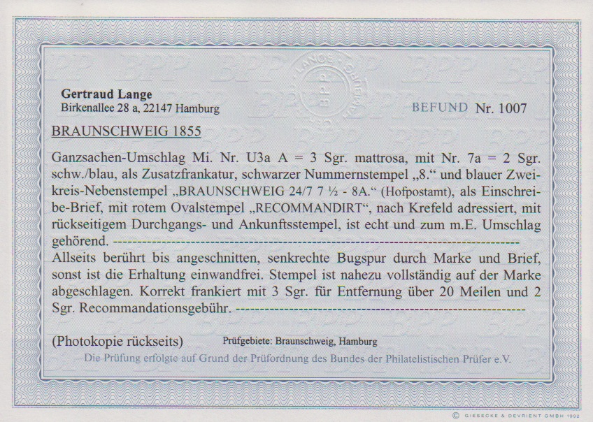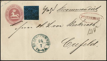 2 Sgr. schw./blau (angeschnitten und Bugspur) in ungewöhnlicher Kombination auf Ganzsache 3 Sgr. rosa, als Postvereins-Einschreibebrief von Braunschweig nach Crefeld, Fotoexp. Lange