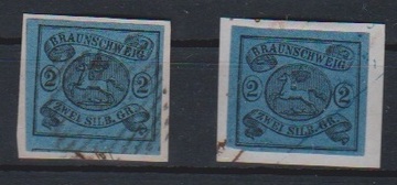 2 Sgr. hellblau (breitrandig!) und 3 Sgr. orangerot je auf Kabinettbriefstücken mit HK von Braunschweig, Mi. 700,-