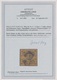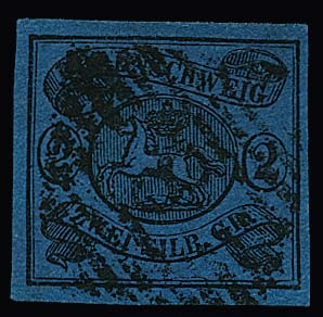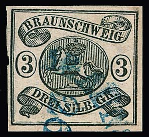 3 Sgr. schw./rosa (rep.) mit hierauf sehr seltener Entwertung durch blauen HK "Braunschweig", lt. beiliegender Kopie (Attest Lange für das zweite Exemplar) ist nur noch ein weiteres Exemplar mit diesem Ortsstempel (auch kleine Mängel) bekannt