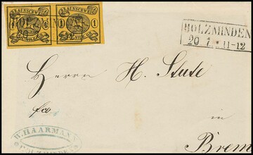 1 Sgr. schw./sämisch, Wasserzeichen "Mundstück nach links", Kabinettpaar mit Ra2 "Holzminden" auf verkürzter Briefvs., sowie sehr breitrandiges Kabinettstück einzeln auf Brief (ohne Seitenklappen) mit HK "Braunschweig". Mi. (750,-)