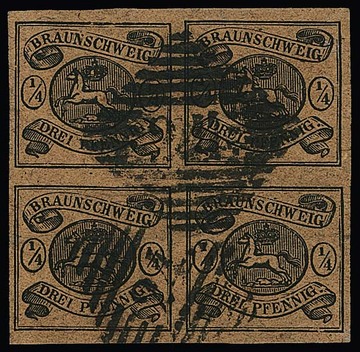 1/4 Ggr. schw./hellbraun, allseits breitrandiger Kabinett-Viererblock mit NS "24" (Holzminden). Seltene Einheit! Atteste Lange, Engel sowie sign. Szekula. Mi. 2500,-