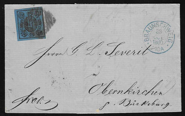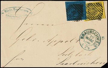 2 Sgr. schw./blau in Mischfrankatur mit 1 Sgr. schw./gelb, beide breitrandig, auf Pracht-Postvereinsbrief (unten schräge Ecke) von Braunschweig 1862 nach Sulzbach, sign. Kruschel