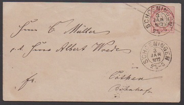 "Schoeningen", nachverw. K2 früh am 3.1.1872 auf Brustschild-Ganzsache 1 Gr. rosa, und spät, 15.6.1875, auf Brief 1 Gr.