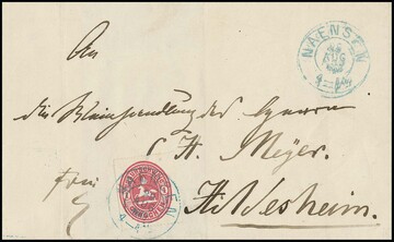 "Naensen", seltener blauer K2 klar auf Kabinettbrief Wappen 1 Gr. rosa 1866, sign. Kruschel