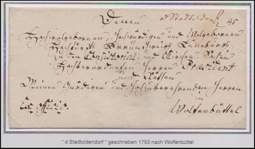 "Stadtoldendorf", 1793-1802, drei Briefe mit frühen handschriftlichen Aufgaben, einmal "d` Stadtoldendorf", sowie zweimal Rötel "St.O."