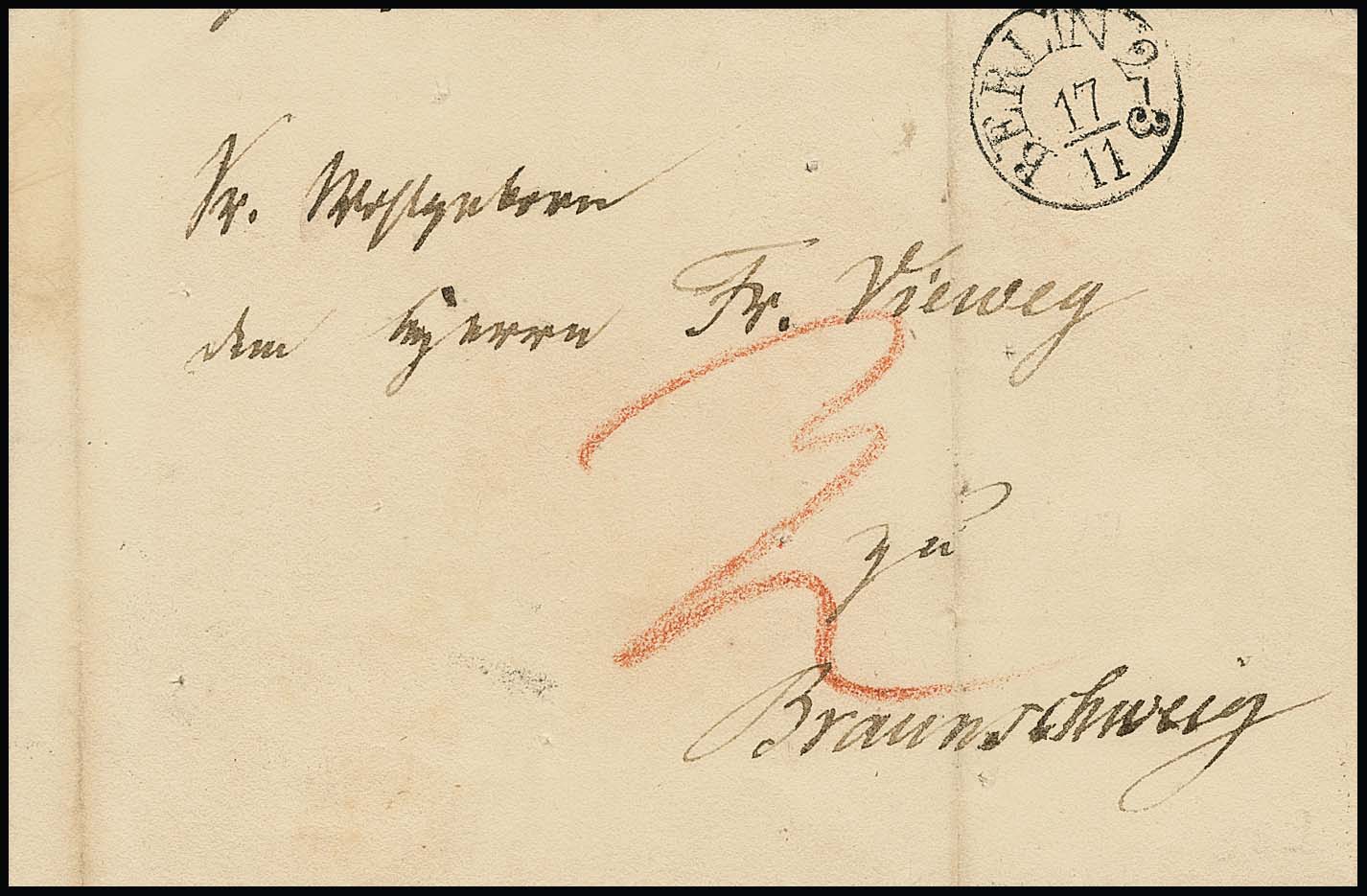 1831, Desinfektionsstempel, der seltene Braunschweiger L2 "H.B. Sanitätsstempel" im typischen Abschlag rs. auf Brief von Berlin nach Braunschweig, Feuser Nr. 45/1000,-