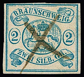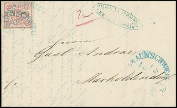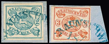 2 Sgr. hellblau (breitrandig!) und 3 Sgr. orangerot je auf Kabinettbriefstücken mit HK von Braunschweig, Mi. 700,-