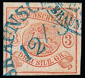 3 Sgr. orangerot, Kabinettstück mit HK "Braunschweig" und Teils eines blauen Absenderstempels, Mi. 350,-