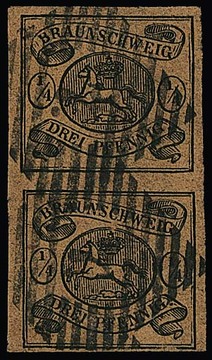 1/4 Ggr. schw./braun, voll- bis breitrandiges senkrechtes Prachtpaar mit klarem NS "7" (Braunlage), sign. Pfenninger u.a. Mi. 900,-