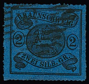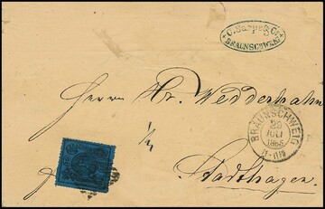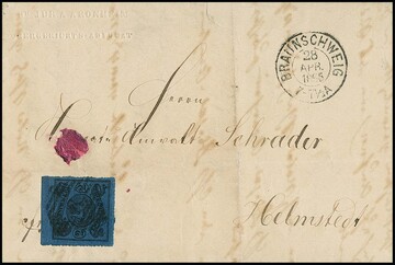2 Sgr. schw./blau, Kabinett-Oberrandstück auf gef. Brief von Braunschweig (K2) 1865 nach Helmstedt. Der Brief (mit mehreren Siegeln, Siegellackrest auch vs.) wurde mehrfach, vermutlich durch privaten Boten, weitergeleitet und dann der Post übergeben, Attest Lange. Mi. 1200,- +