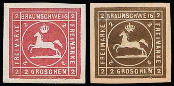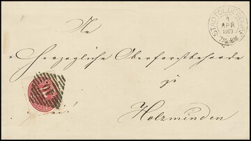 1 Gr. karmin, vier meist Prachtbriefe mit versch. Abstempelungen: Ra2 "Oker" in schwarz, "Seesen" in blau, K2 "Braunschweig", sowie NS "40" und K2 "Stadtoldendorf", Mi. 720,-