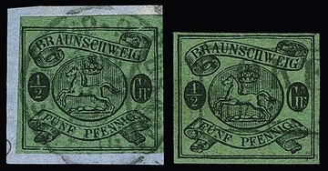 1/2 Gr. schw./grün, normales Papier (Briefstück mit K2 "Braunschweig"), sowie auf dünnem Papier (Kabinettstück mit Ra2 "Oker"), beide tadellos, sign. Lange. Mi. 800,-