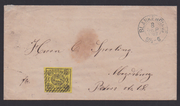 1 Sgr. schw./gelb, breitrandiges Kabinettstück auf Couvert von Blankenburg 1863 nach Magdeburg