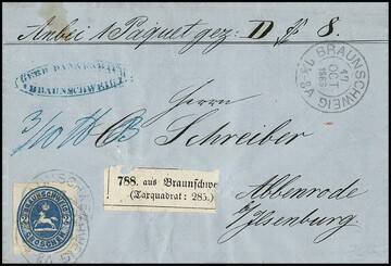 2 Gr. blau, teils Scherentrennung, in sehr seltener Verwendung auf frankiertem Paketbegleitbrief mit K2 "Braunschweig" 1865 nach Abbenrode bei Ilsenburg
