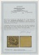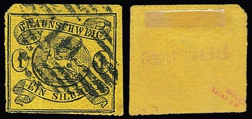 1 Sgr. schw./gelb, der seltene linienförmige Versuchs-Durchstich "17" an allen vier Seiten, davon zweiseitig sehr gut meßbar innerhalb der Scherentrennung, unten und links typisch etwas unregelmäßig. Ausser einer etwas schrägen Ecke links oben sowie etwas Scherentrennung unten sehr gute Gesamterhaltung dieser seltenen Marke, klar gestempelt mit NS "19" von Harzburg, Mi. 7000,-, sign. Köhler, Ruhland, R. F. Engel, sowie Attest Walter Engel, sowie Attest Lange