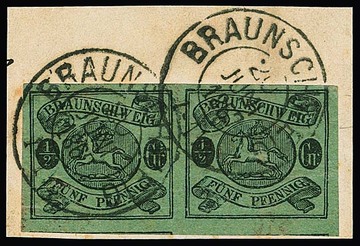 1/2 Gr. schw./grün, dünnes Papier, teils überrandiges Paar (unten Nebenmarken!) auf Kabinettbriefstück mit K2 "Braunschweig". Mi. 1200,-