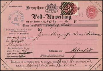 1 Gr. rosa (oben Scherentrennung, gering "eckrund") auf Postanweisungs-Ganzsache 1 Gr. rosa (typische Faltspur ausserhalb), mit klarem NS "28" und K2 "Königslutter" nach Helmstedt. Die Zusatzfrankatur war erforderlich, weil der Postanweisungsbetrag über 25 Thaler (hier 30) lag und das Porto dann 2 Gr. betrug. Attest Lange