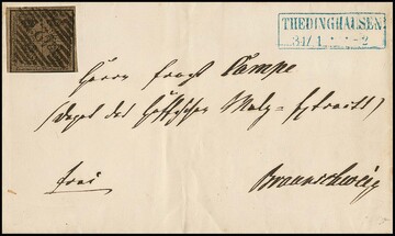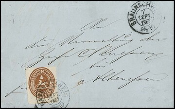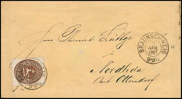 3 Gr. braun auf Kabinettbrief mit K2 "Braunschweig" 1867 nach Altenessen, sign. Krause und Fotoexp. Lange. Mi. 600,-