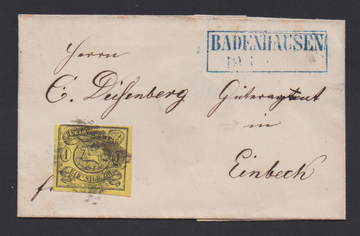 "1" nebst blauem Ra2 "Badenhausen" auf kleinem Briefchen mit 1 Sgr. (winzig ber.)