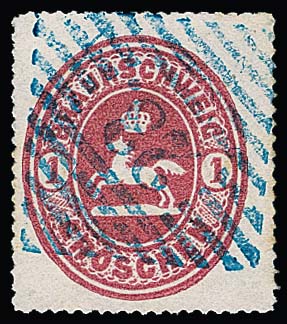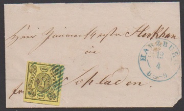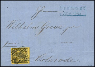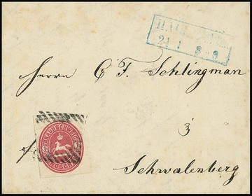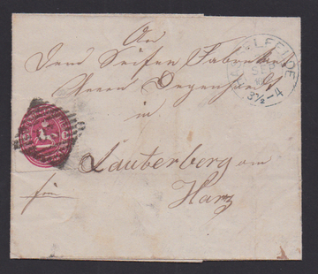 "18", sehr zarter schwarzer NS, nebst blauem Ra2 "Halle a.d. Weser", auf Brief mit Wappen 1 Gr. (teils Scherentrennung) 1866, seltene Kombination, sign. Kruschel