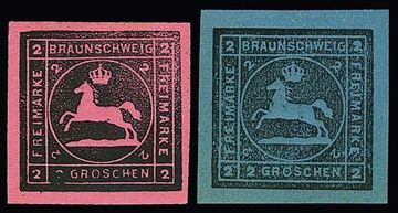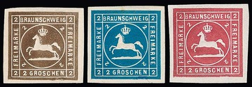 "8" (Braunschweig) auf drei Kabinettstücken 2 Sgr. (Mi. 380,-), sowie auf 3 Sgr. (kl. Mgl.)