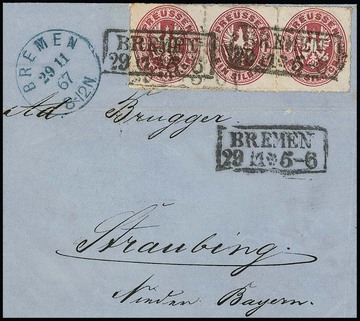 1867, Faltbrief (links etwas verkürzt und leichte Patina) mit Dreierstreifen Preußen 1 Sgr. rosa, beim Stadtpostamt aufgegeben mit schwarzem Ra2 und dann als Postwechselbrief mit blauem K1 "Bremen" dem preußischen Postamt übergeben nach Straubing in Bayern